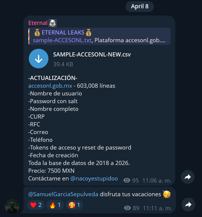 El portal AccesoNL, la llave maestra de identidad digital para los ciudadanos de Nuevo León, ha vuelto a ser vulnerado. El pasado 8 de abril de 2026, el actor de amenazas conocido como Eternal publicó en su canal de Telegram la exfiltración de una base de datos masiva que comprende 603,008 registros, abarcando toda la actividad del portal desde el año 2018 hasta la fecha actual.
